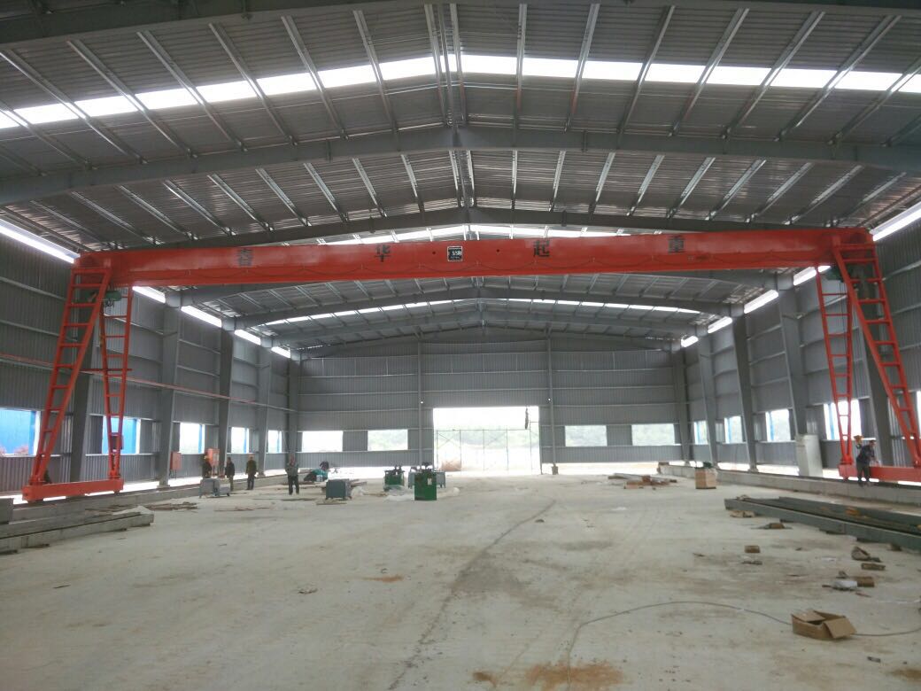 起重機(jī)門架由主梁、地梁、支腿、梯子平臺(tái)等部分組成。 主梁是葫蘆式起重機(jī)的主要承載構(gòu)件,同時(shí)又是懸掛電動(dòng)葫蘆的運(yùn)行軌道。主梁由角鋼等型鋼焊接的支撐架與工字鋼組焊成三角形梁。主梁按要求制做成上拱形,電動(dòng)葫蘆小車在工字鋼翼緣上運(yùn)行。當(dāng)額定起重量和葫蘆自重位于跨中時(shí)引起的下?lián)喜坏玫陀谒骄€,正常工作時(shí)無(wú)永久變形。主梁跨度位置兩側(cè)設(shè)計(jì)有與支腿連接的馬鞍座,并有矩形鋼板連接法蘭。地梁是支承主梁和載荷的基礎(chǔ),同時(shí)也是主梁與運(yùn)行機(jī)構(gòu)的紐帶,是合肥起重機(jī)金屬結(jié)構(gòu)的主要承載構(gòu)件之一,主要由角鋼焊接而成,地梁端部設(shè)有緩沖器。