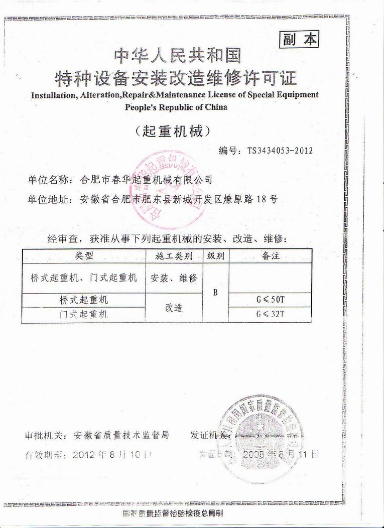 版權(quán)所有 © 合肥市春華起重機械有限公司 地址:合肥市肥東新城開發(fā)區(qū)燎原南路18號 聯(lián)系電話:0551-67709358 手機:13855153944